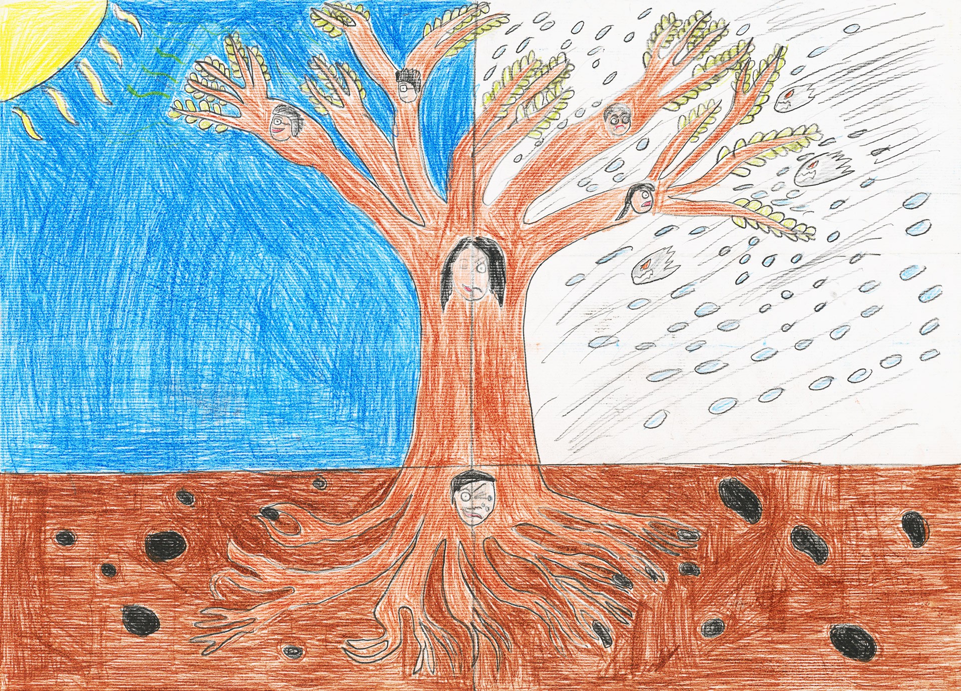 一棵樹面對太陽和風雨的樣子,我希望我的家像那棵樹,在困難時就像樹幹一樣團結,在順利時有東西一起分享。