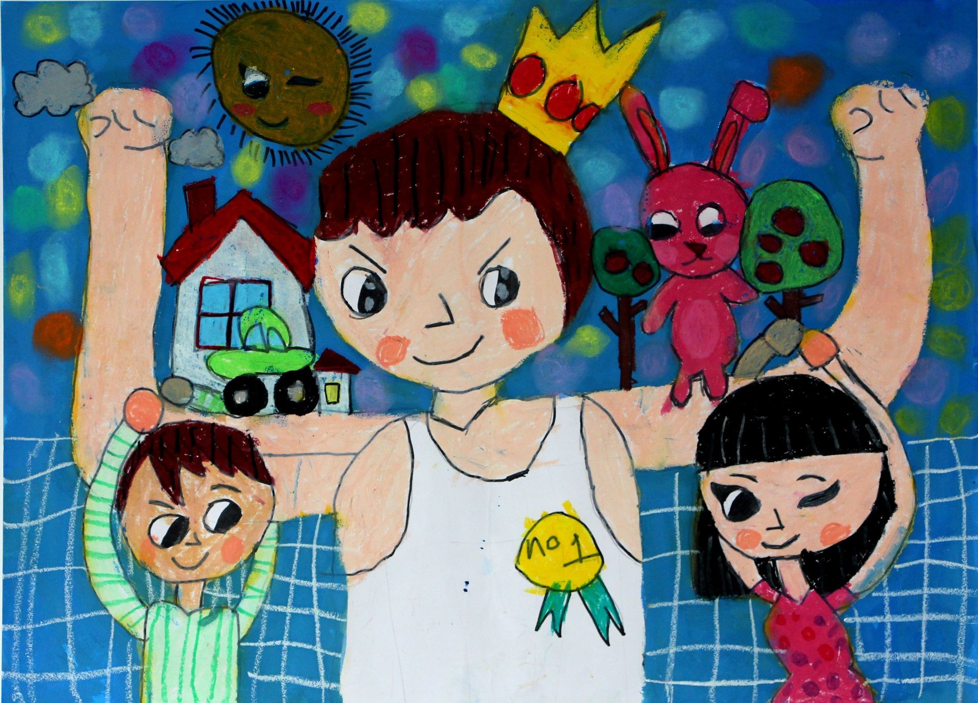 王O槿小朋友: 我畫的圖片是我的超級媽媽,守護我們家中大大小小的人,我媽媽要照顧家庭又要照顧我們這一群小孩,媽媽的力氣真的可以守護家中的大大小小,什麼事情都包辦,真的是家中的女強人。