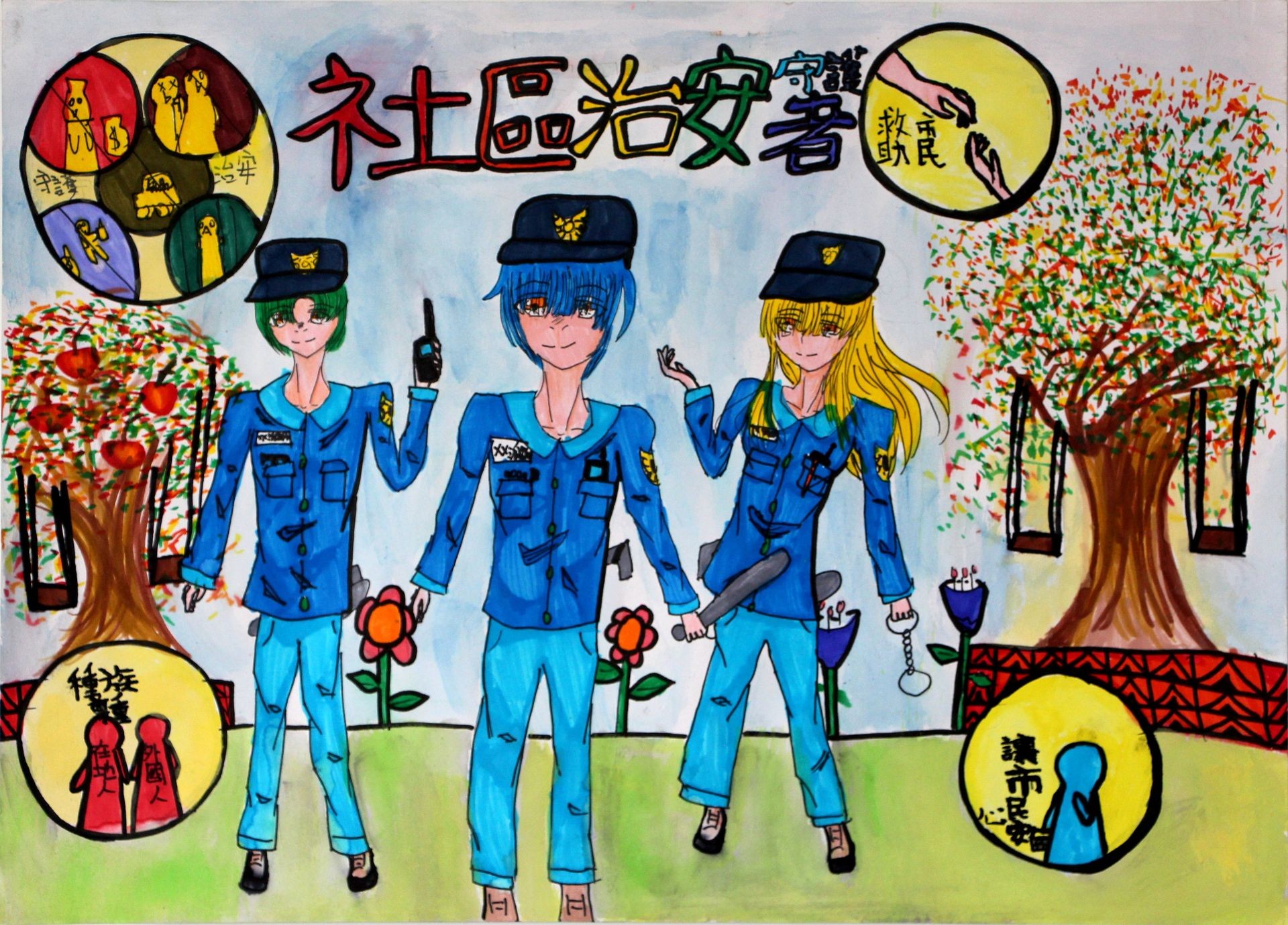 孟O庭小朋友: 社區中有許多壞人藏在角落,我們可能會被突如其來的惡霸給傷害,所以警察們會想盡辦法守護社區的治安,我們要感謝他們。