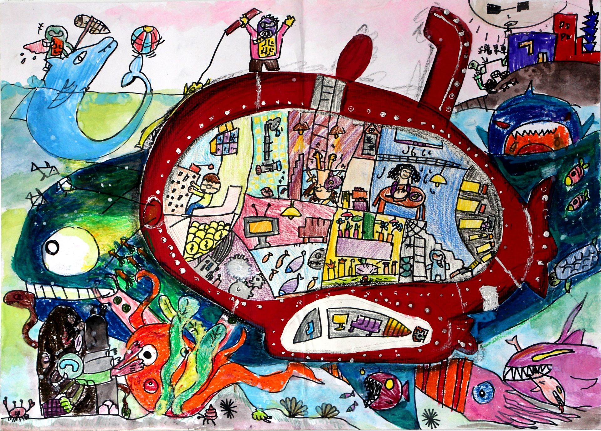 廖O凡小朋友: 我畫的夢想家是潛水艇的家,裡面有很多房間。可以帶我們到處去旅行,想要吃青菜時就要回去台灣買青菜,如果累了就找一個很近的岸邊休息