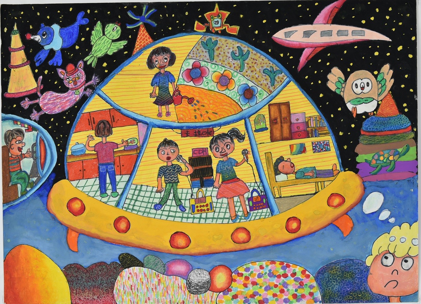 柯O絜小朋友: 我的作品就像漂亮的宇宙一樣的世界,我希望我以後的家就像這樣的世界。神秘又溫馨,讓夢想成真。