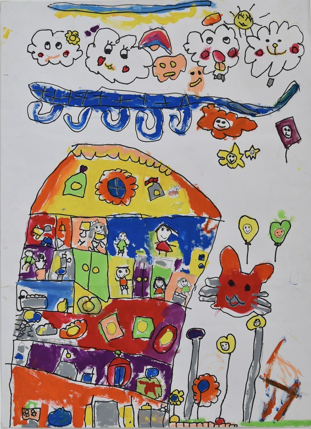 蔡O臻小朋友: 我和親愛的家人平安健康,且和樂融融地共同居住在幸福建築中,彼此互相照應及分工合作,生活周遭所見的一切事物,總是美好的藍天、白雲、路燈等都在微笑著!