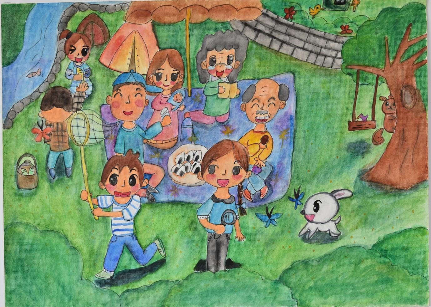 蔣O寧小朋友: 假日時,全家人一起野餐,我和弟弟一起欣賞蝴蝶,把蝴蝶帶回家觀察,然後再放生,表弟和表妹在河邊抓魚,爸爸、媽媽、爺爺和奶奶坐在野餐墊上面吃點心,小狗在草地上奔跑,全家人一起度過快樂的一天。