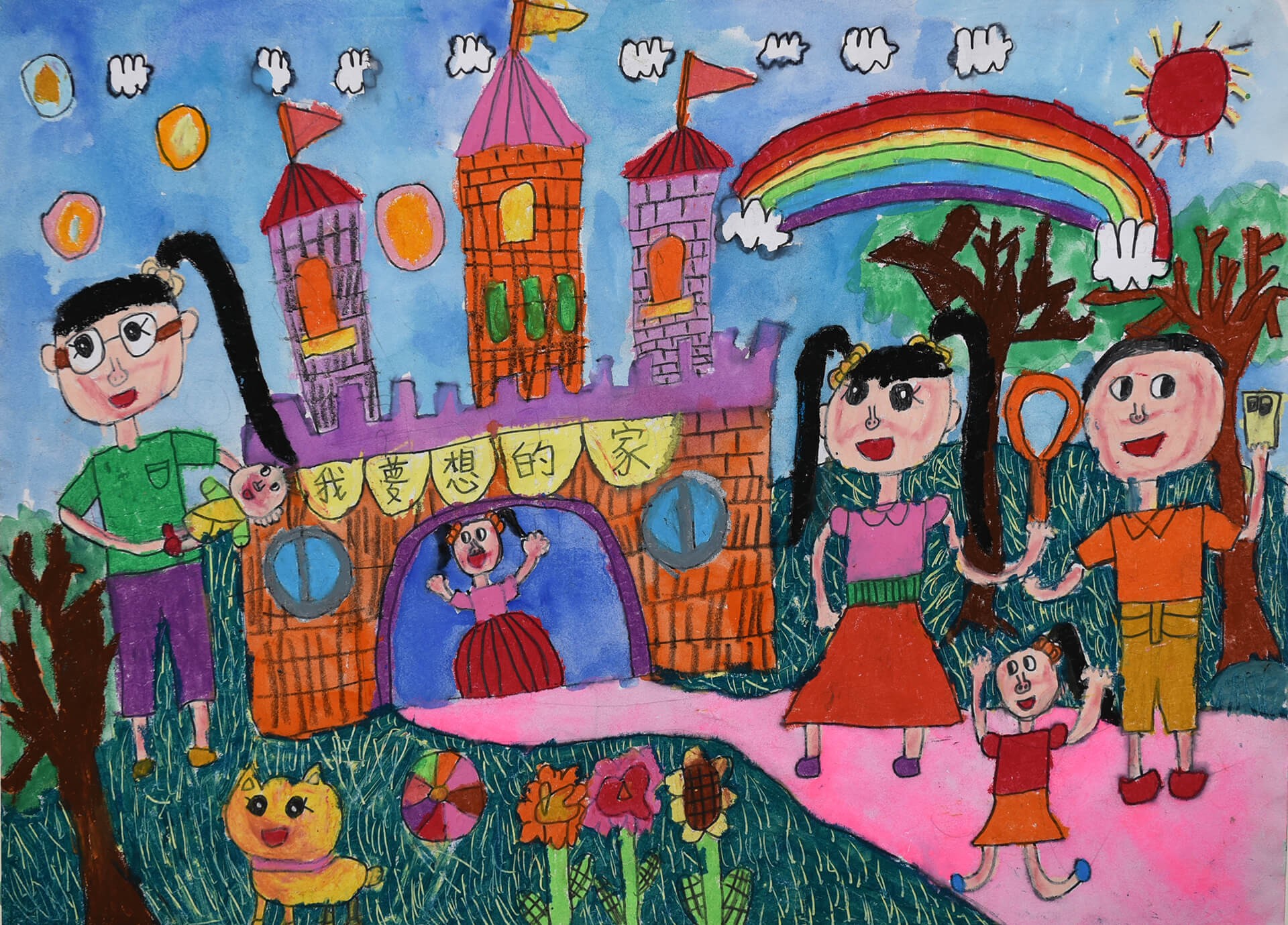 吳O穎小朋友: 我夢想的家是住在城堡裡,放假的時候,全家陪我玩泡泡棒,看到彩色的泡泡和天空中美麗的彩虹,我覺得很幸福。