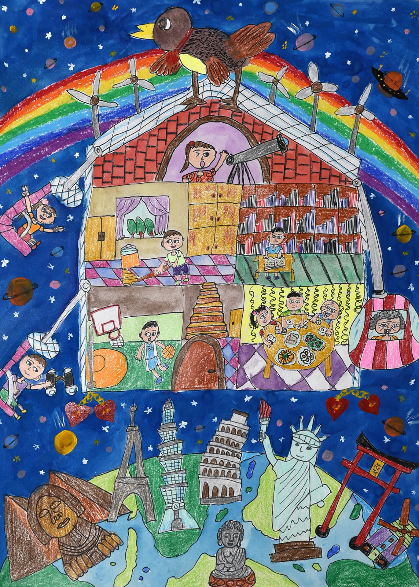 郭O菱小朋友: 我覺得全家人在一起就是幸福,萬能鳥兒帶著全家人出發,讓阿公阿嬤一起環遊世界,飛向太空,太陽能不會汙染環境,全家人快樂的一起生活。