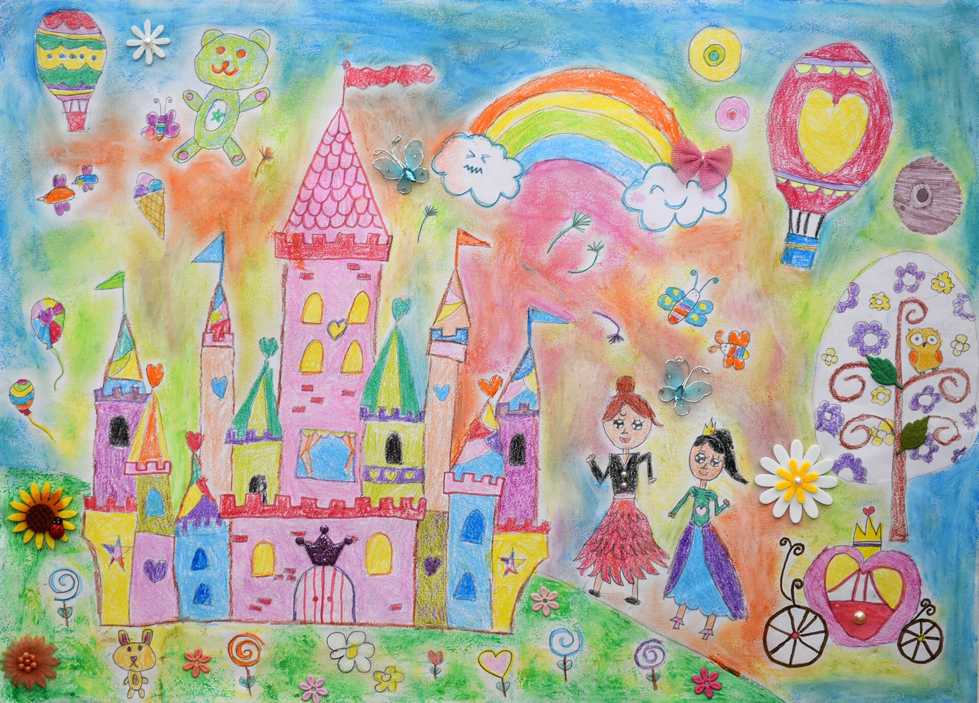 黃O晰小朋友: 小女孩內心夢想著自己住在童話故事裡的城堡,藉由塑造出一個以童話般周邊人物為藍本的「我夢想的家」運用色彩,活潑的表現出來。