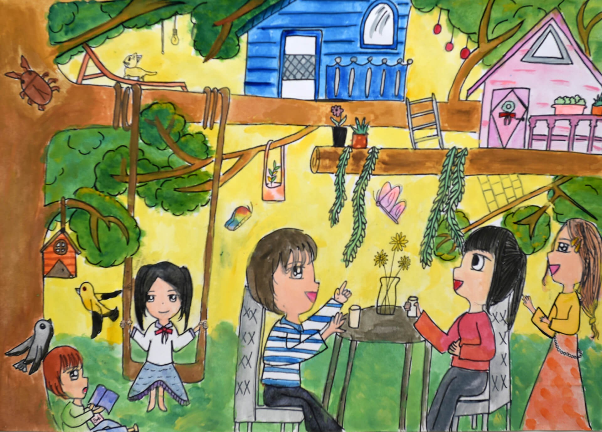 張O筑小朋友: 我夢想的家,希望可以住在樹上,因為很涼,微風輕輕吹拂,感覺很舒服,很好睡覺,而且在樹上可以俯瞰小鎮,希望可以住在上面。