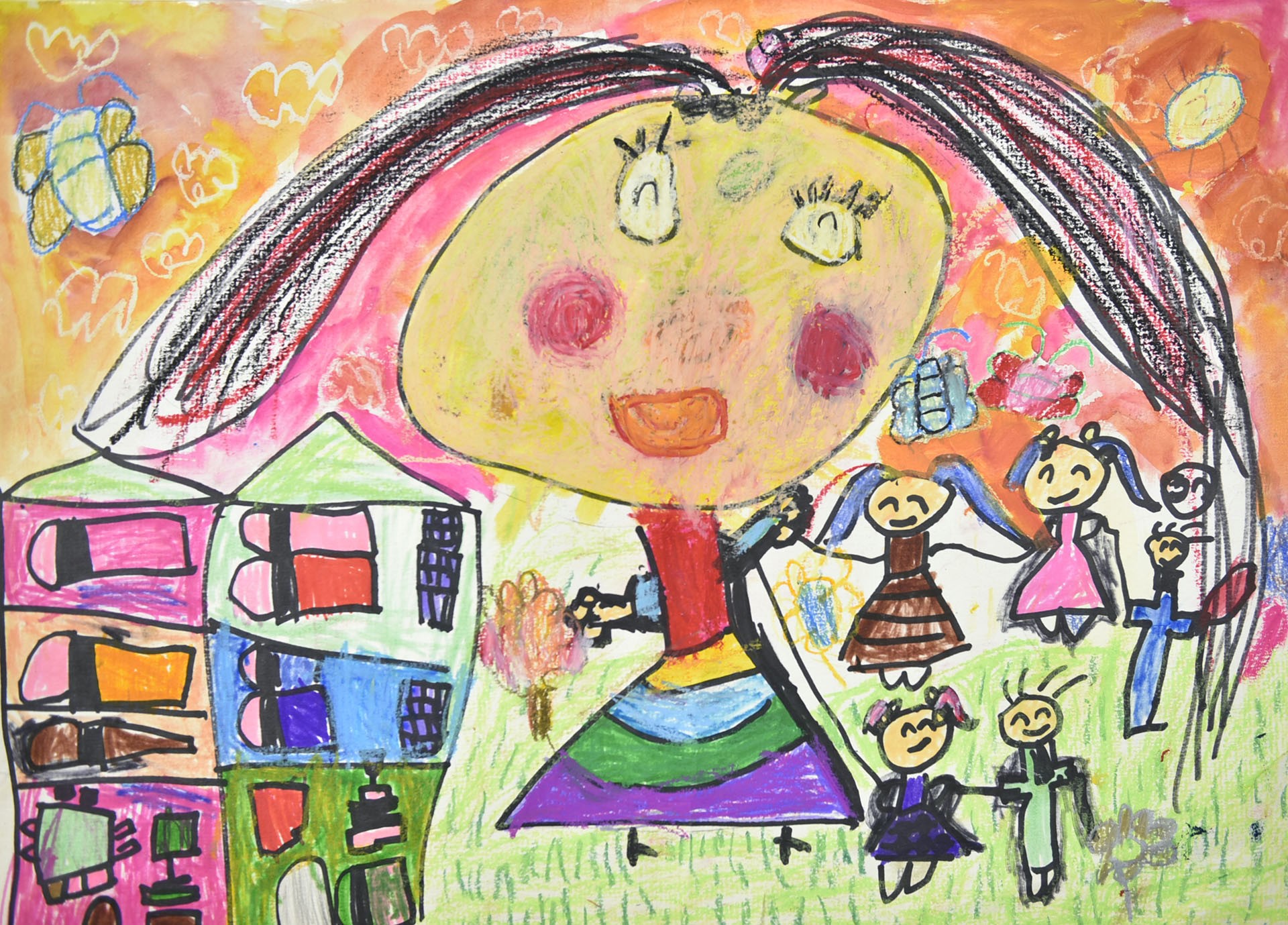我畫我和姊姊、爸爸、媽媽手牽手,下面是朋友和我們住在一起,左邊是我們一起住的房子,大家住在一起很開心。