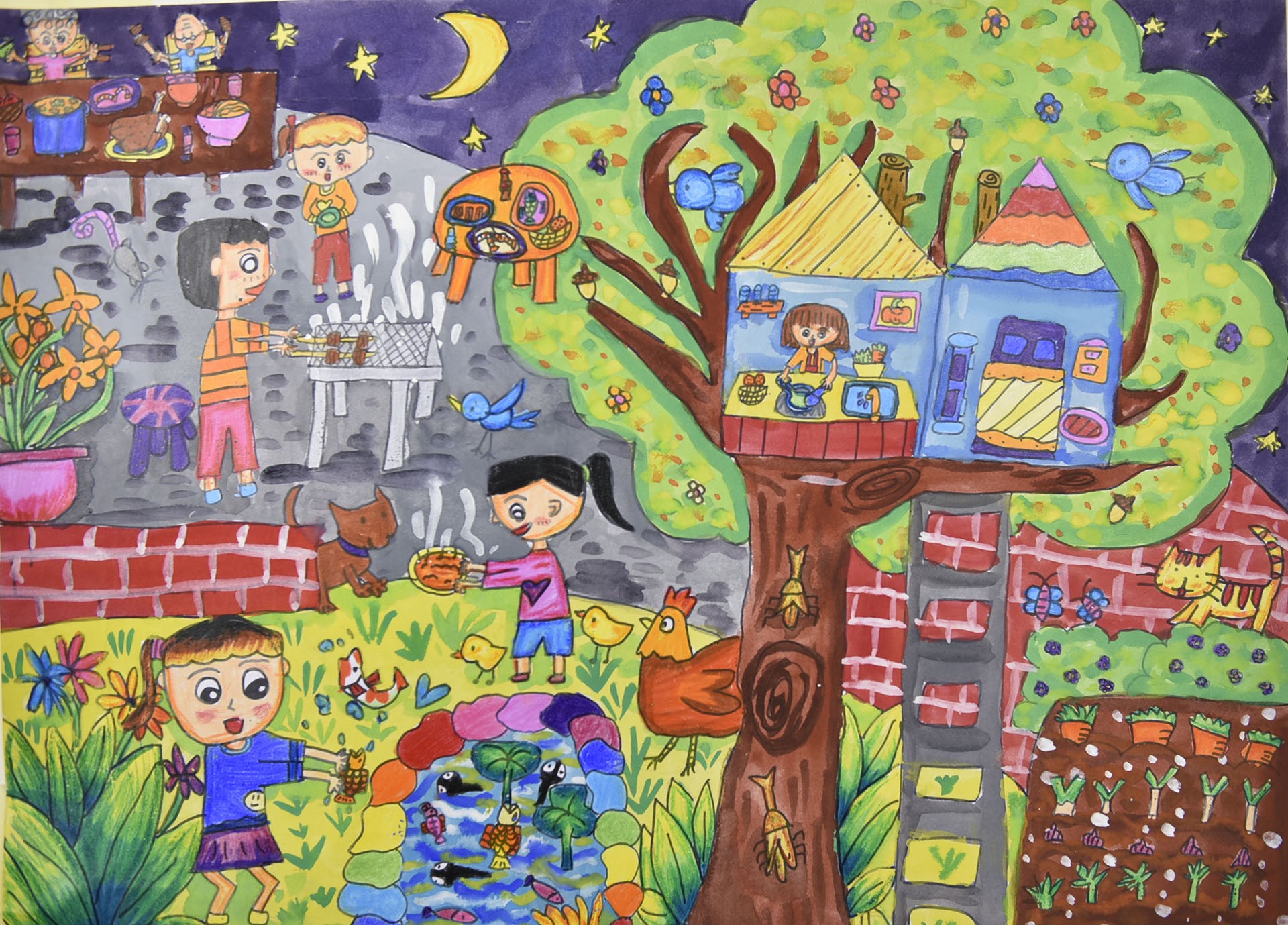 夜裡,秘密樹屋正傳來切東西的聲音,樹屋下也傳來烤肉的香氣,爺爺奶奶開心的等著爸爸的烤肉神技,我們三姊妹在農園裡開心的玩樂!多快樂的時光!