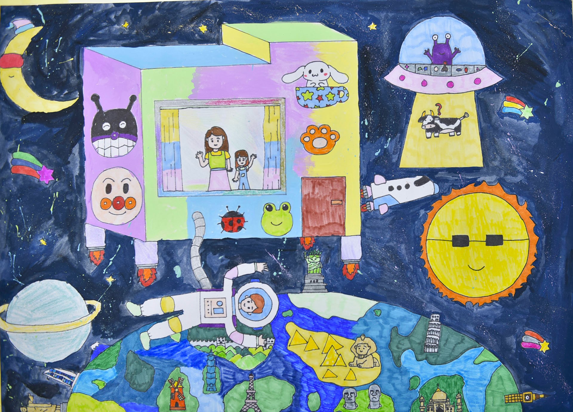 我夢想的家是一棟可以飛的彩色巴士,上面有我們全家人喜歡的圖案,載著我們飛到外太空,俯瞰著美麗的地球。