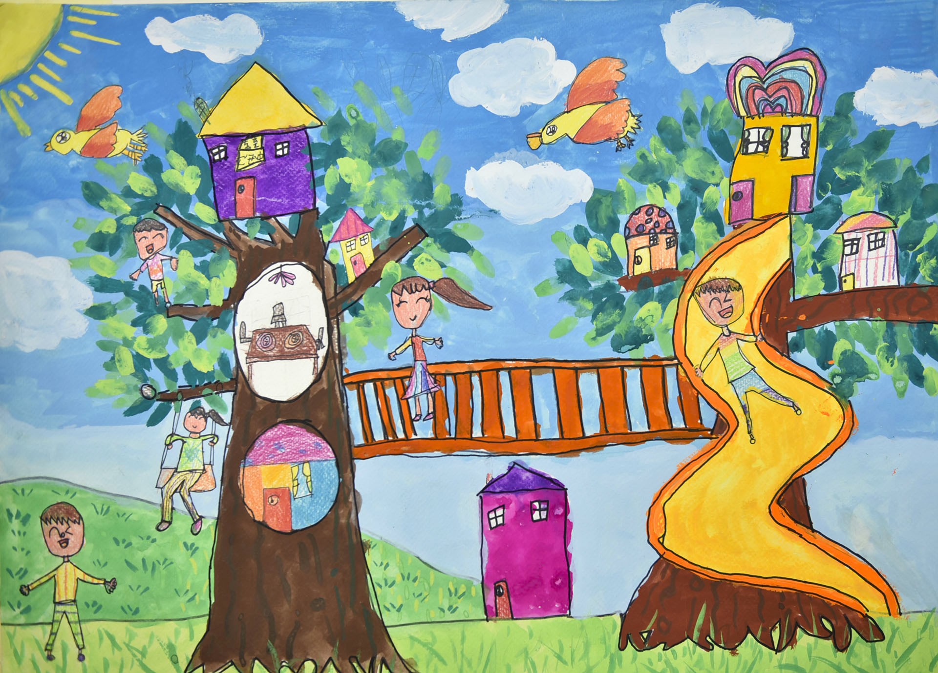 我希望我的家住在樹上,這樣空氣會很好,我每天去吊橋,去找我的兩個特別朋友,彩虹鳥和樹精靈,我們一起去餐廳吃飯,一起溜滑梯、盪鞦韆,每天都很開心。