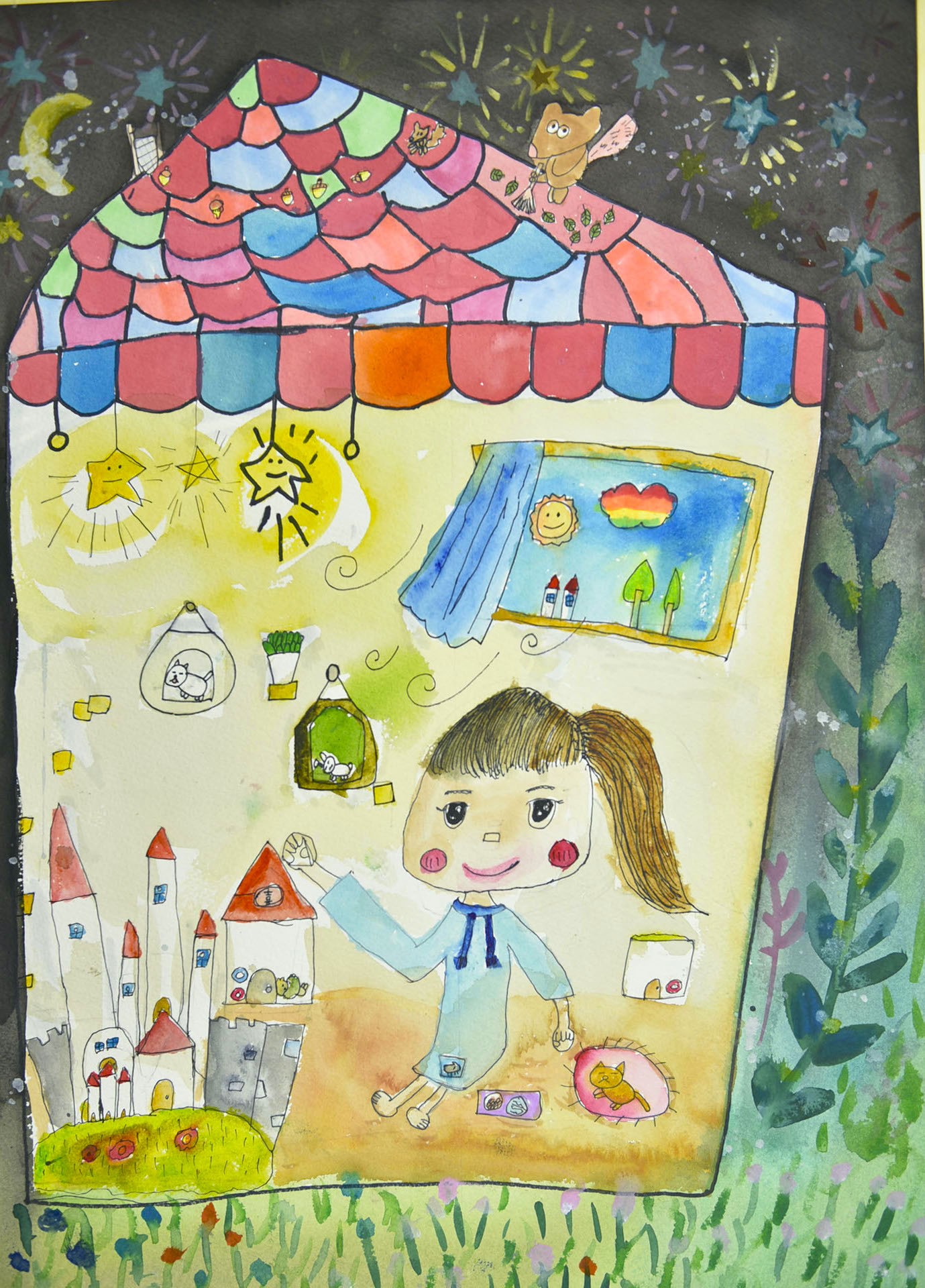 在五彩繽紛的屋簷下,有個愛作夢的小女孩,有開心的星星閃著溫暖的光線,魔法窗戶吹進微風,讓貓咪、兔子、倉鼠都安靜地睡著了,女孩認真地望著夢想的家(城堡)。