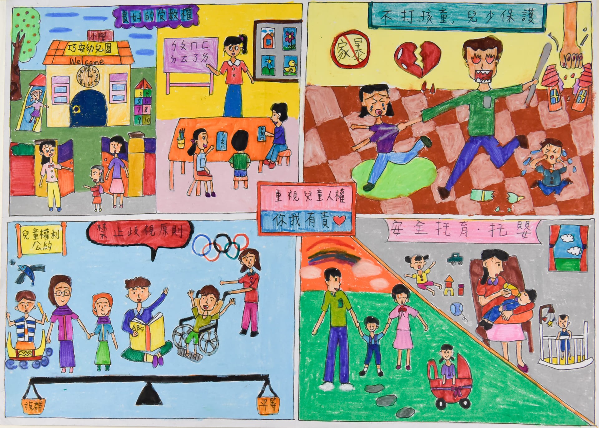 畫作呈現兒童需要良好的生存與發展權,父母提供兒童完整的育樂、食、衣、住、行及教育權和營造兒童安全的成長環境。