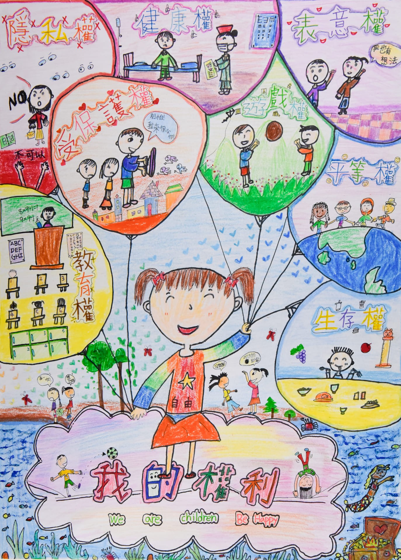 氣球是童年的天真快樂,大海和島嶼代表寬闊自由,在充滿愛的保護下,成長且擁有各項兒童權利,就是幸福的小孩。