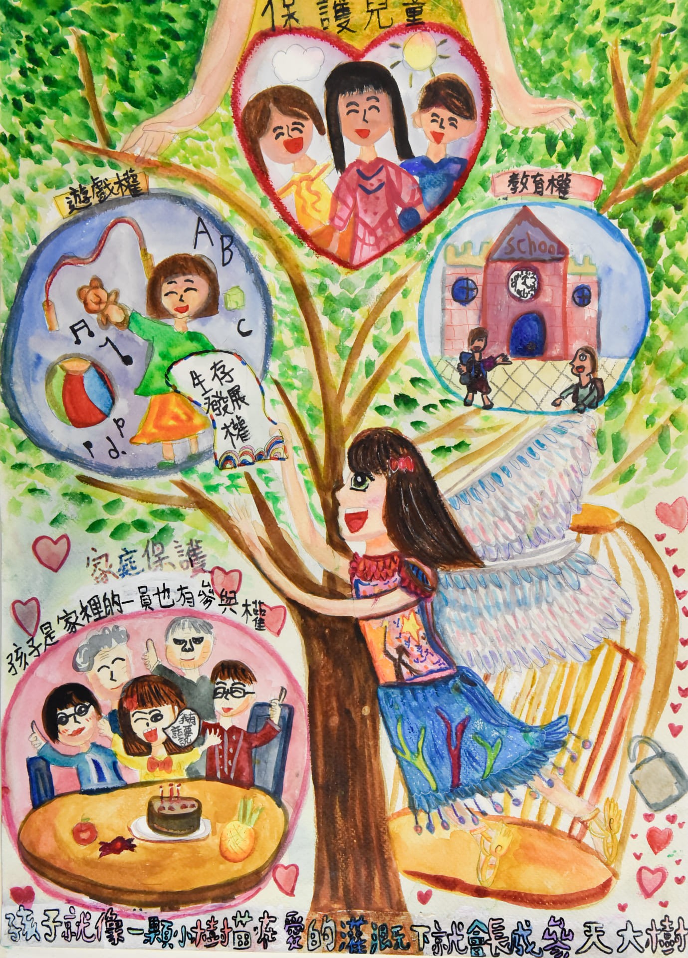 我的作品呈現兒童四大公約,一、兒童教育權、二、兒童生存與發展權、三、兒童教育權、四、兒童參與權,兒童在愛的保護下,就能健康快樂的成長。
