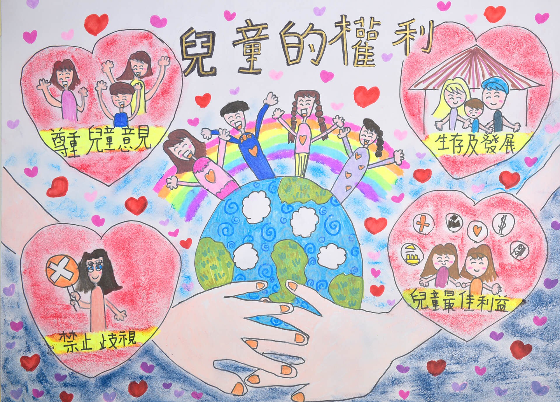 畫作主題:兒童權 1. 尊重兒童權利與意見 2. 給予兒童平等的生活環境 3. 照顧兒童身心發展 4. 培養兒童世界觀平等對待