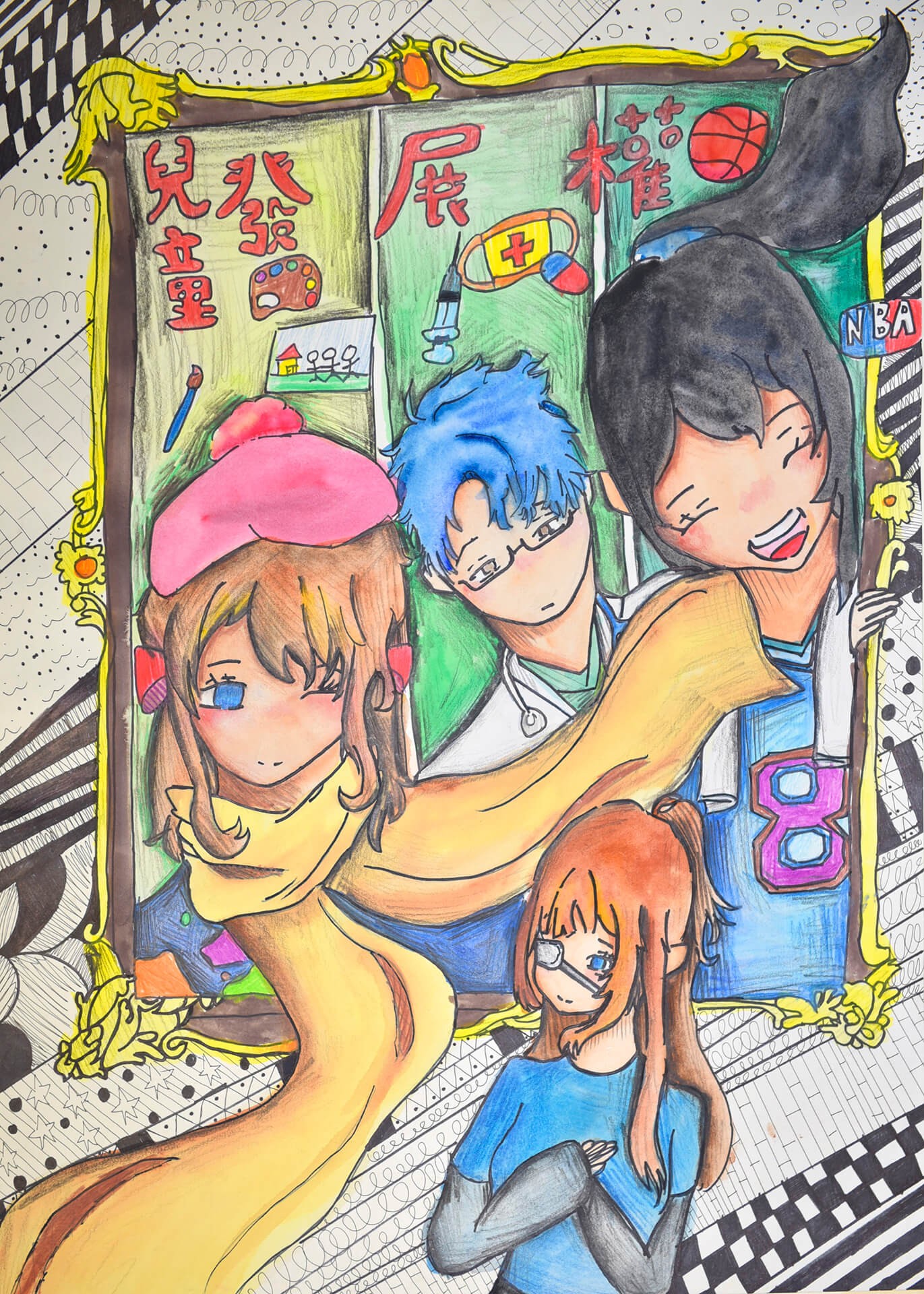 畫作主題:發展權 我畫這一張在說明我們兒童也是有發展權的,我們可往自己未來喜歡去做選擇,如畫家、醫生、籃球員等等各方面來發展。