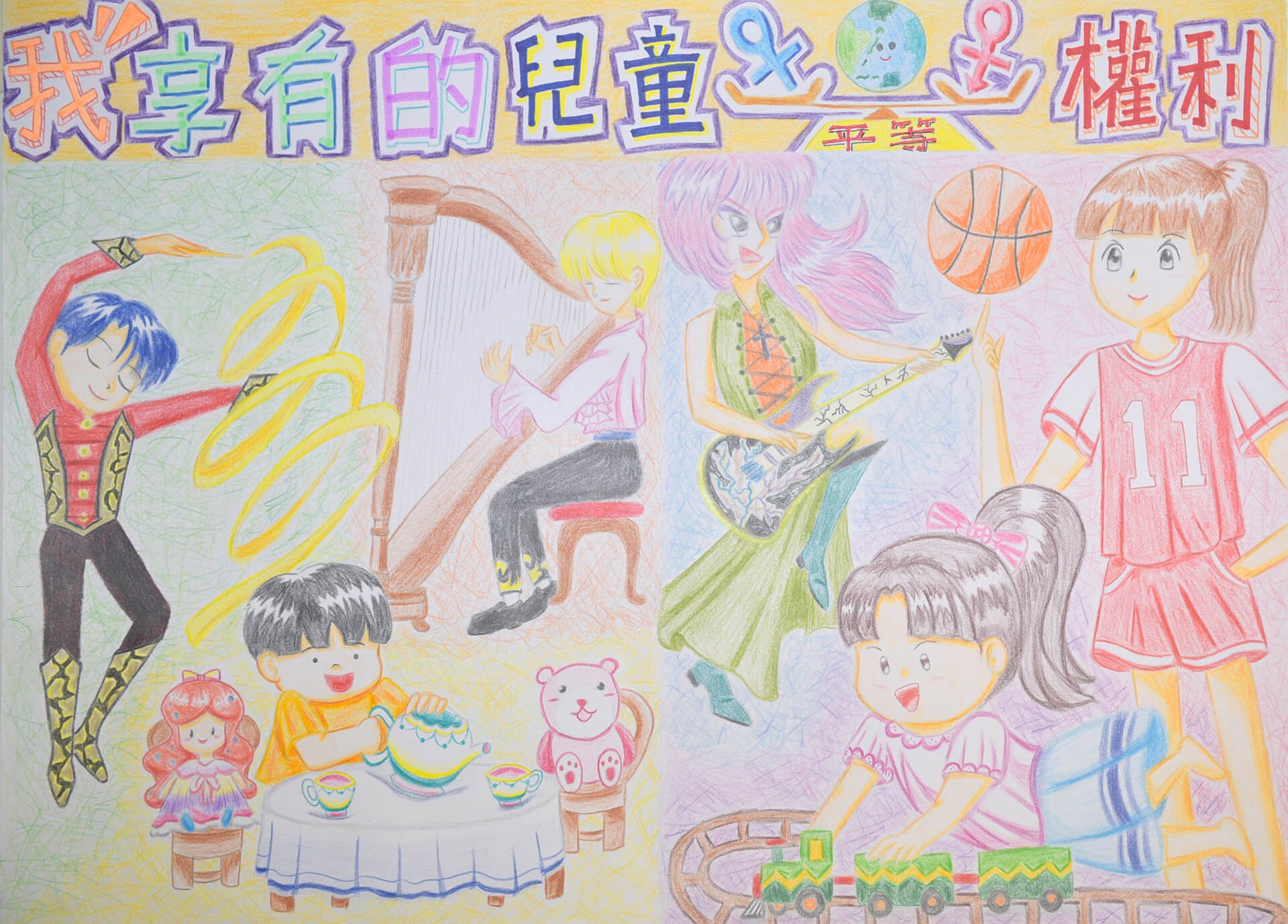 畫作主題:平等權 在「我享有的兒童男女平等權力」的畫裡,我希望全世界所有的兒童,都能夠受到平等的對待,不應在舊有的觀念中有所歧視,男生的心也可以很柔軟,喜歡玩扮家家酒、跳芭蕾舞、彈豎琴…,女生也可以很堅韌、喜歡玩車子,當籃球員、當電吉他手…。