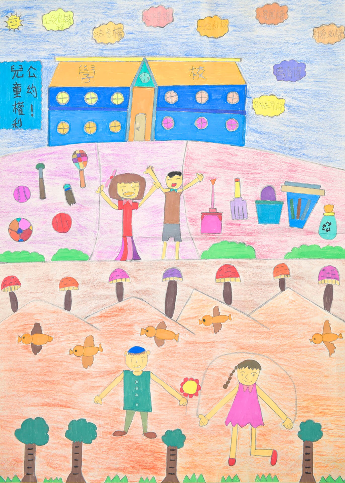 畫作主題:兒童權 我想表示我們兒童還大人在學校還是外面玩遊戲時我們是對的都有權利表達。