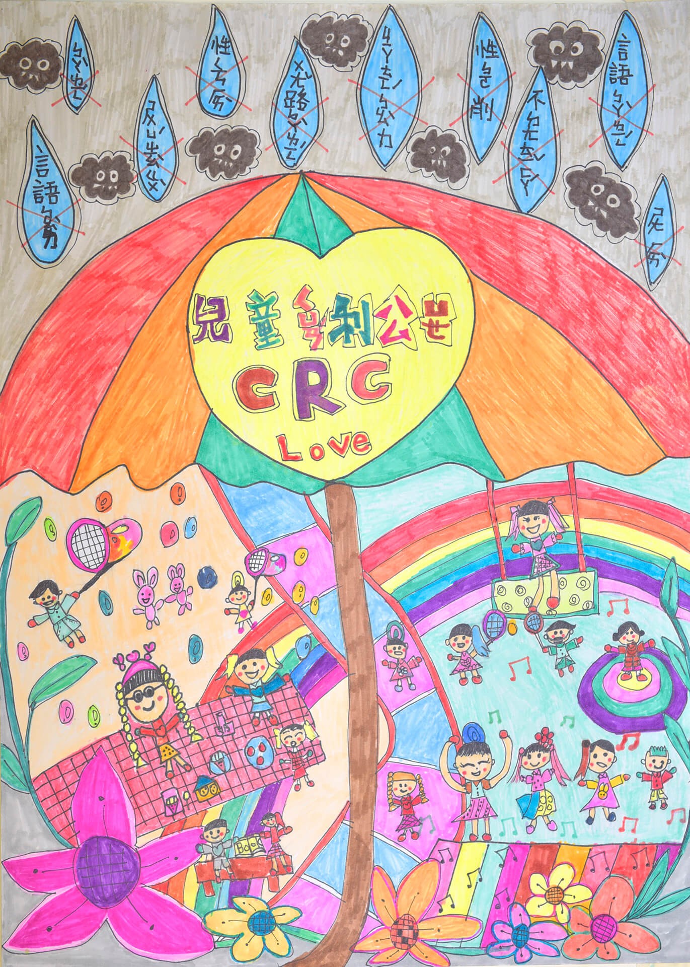 畫作主題:保護遊戲權 兒童接受保護,在大傘下成長茁壯、無憂無慮,可以體驗各種運動,可以享受多樣化遊戲方式。