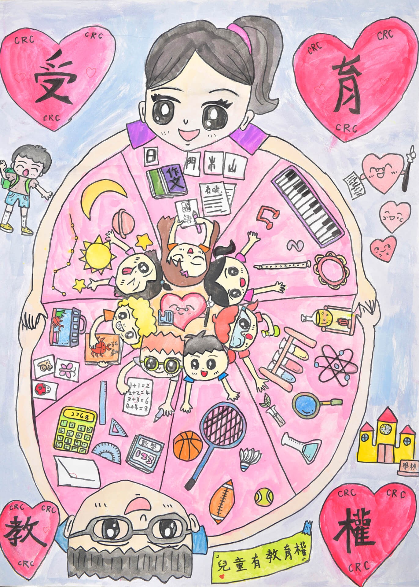 畫作主題:教育權 兒童有受教育的權利,部論是哪方面的知識、技能,都可多方面選擇學習。且不論貧富、種族,只要是兒童,我們都要保護其教育權。