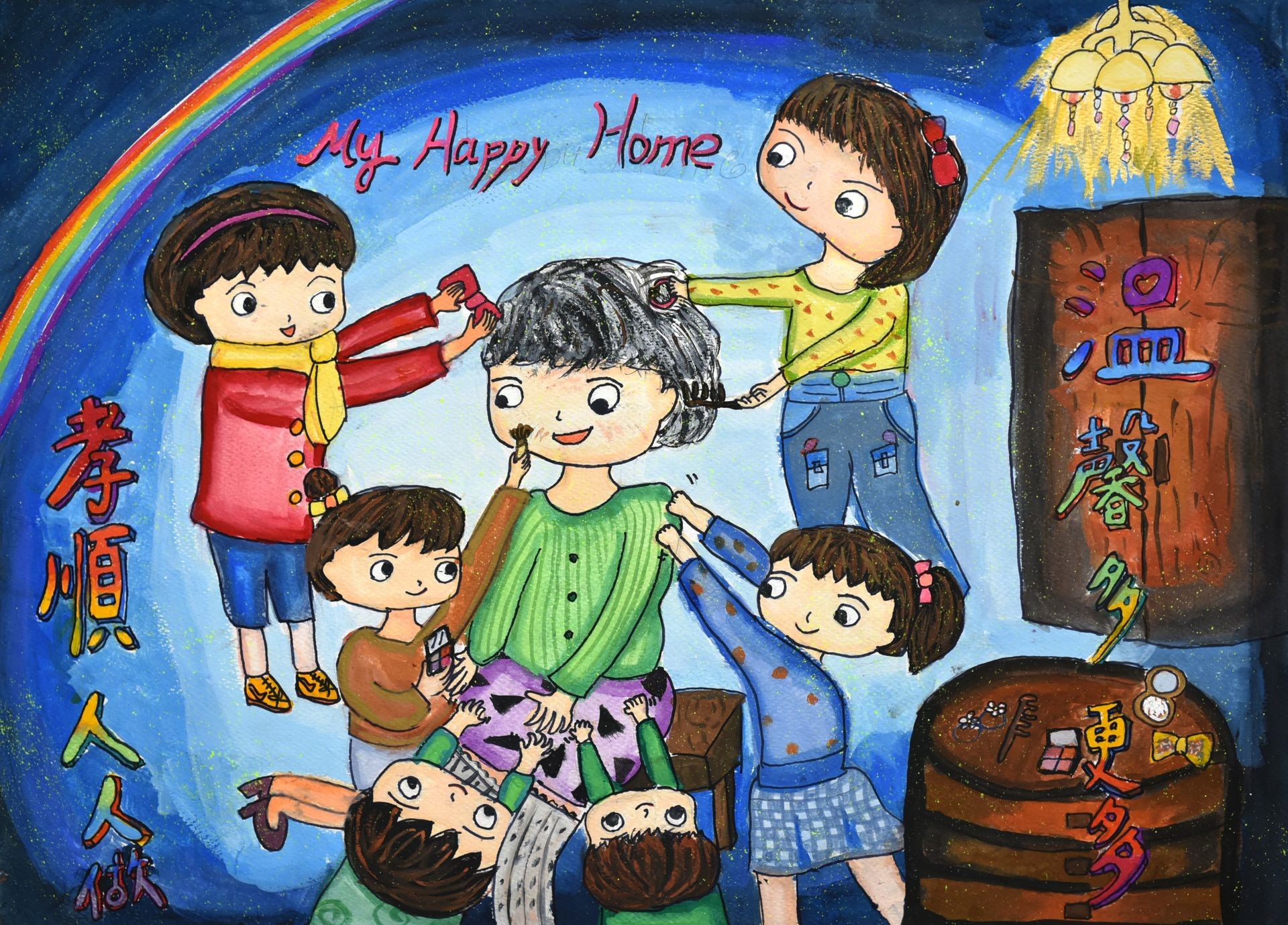阿嬤常常幫助我們,我便想利用這幅畫感謝她,讓全家總動員一起幫她按摩、搥背。我幫她捶背;表弟、表哥幫她按摩;姐姐幫她梳頭髮;表妹幫她戴蝴蝶結;媽媽幫她化妝。大家一起孝順阿嬤,讓他每天漂漂亮亮的出門,美美麗麗的回家。