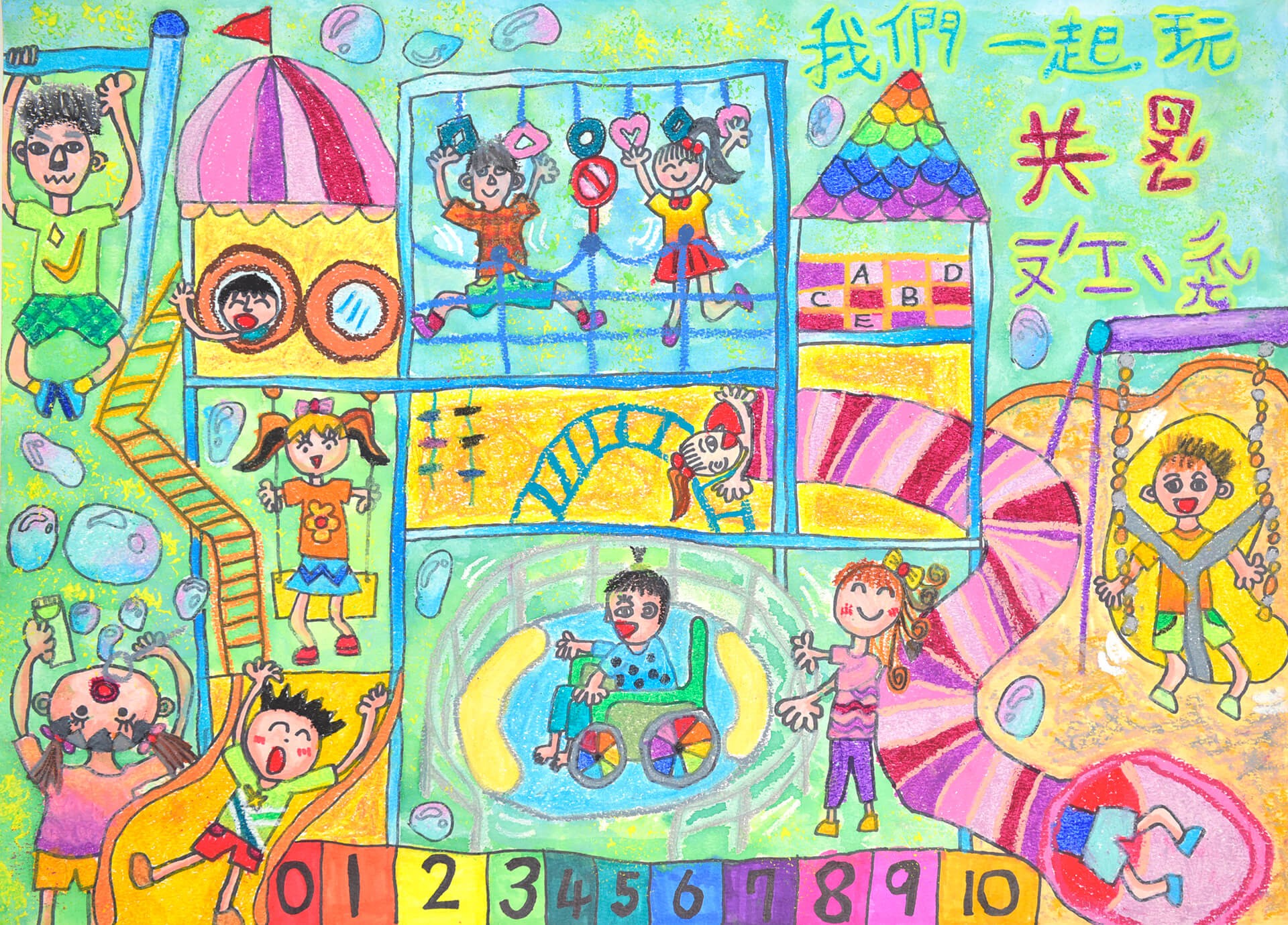 畫作主題:遊戲權 「玩」是一件重要的事,每個小孩都喜歡玩,對身障者來說「玩」可不是一件容易的事,需要克服重重阻礙,在共融式遊戲場裡,身障兒童可與大家一起享受一起玩,真的是一件很棒的事呢!