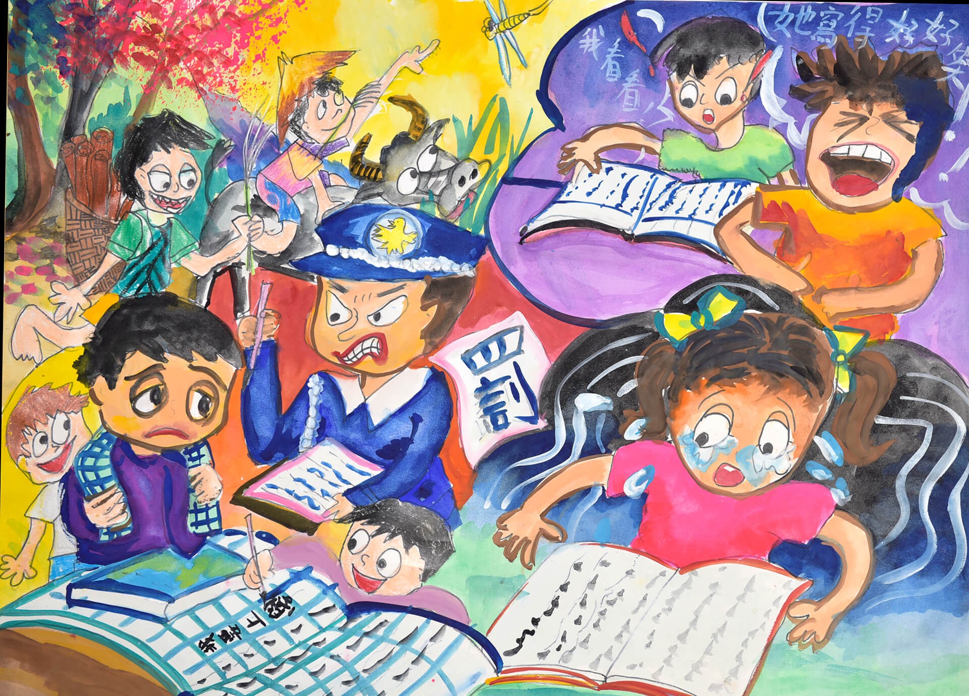 畫作主題:教育權和隱私權 兒童有受教育的權利,中小學是義務教育,在台灣的每個兒童均受到法律的保障,不能剝奪兒童的受教權。每個人也有自己的隱私權,不能隨意侵犯,也不能偷看別人的日記,那是屬於個人生活的私密領域。