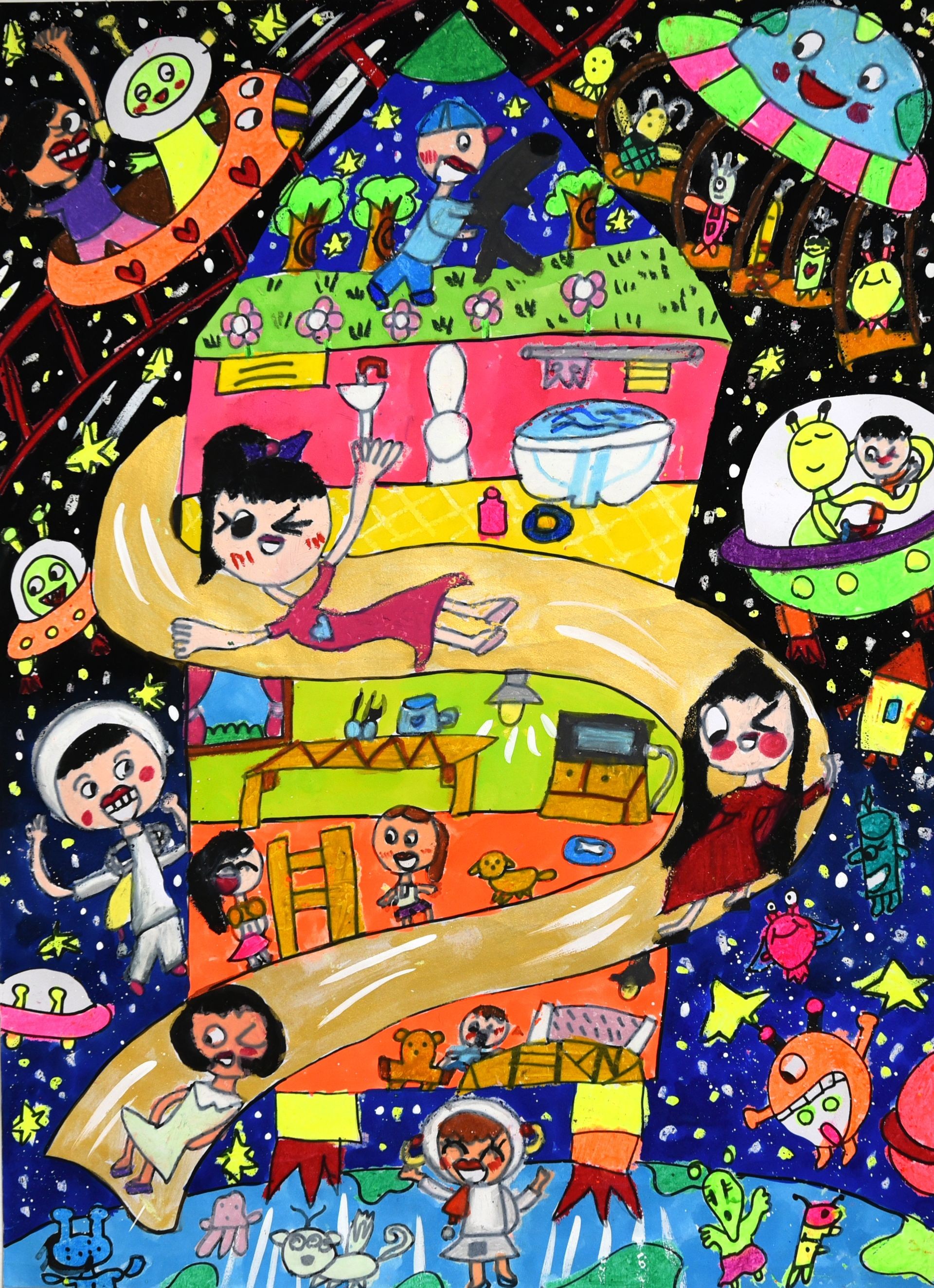 住在火箭上飛往浩瀚的太空,可以和太空人、外星人做朋友,還可以到太空遊樂園玩耍,刺激又有趣,難忘的冒險旅程阿!歡迎大家來搭乘。
