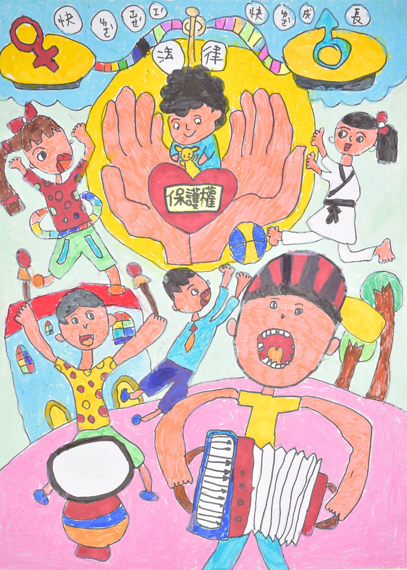 畫作主題:受保護權 你我一起保護兒童,男生女生一樣好,讓兒童快樂學習快樂成長,守護兒童不受傷害,讓家庭、社會充滿歡樂。