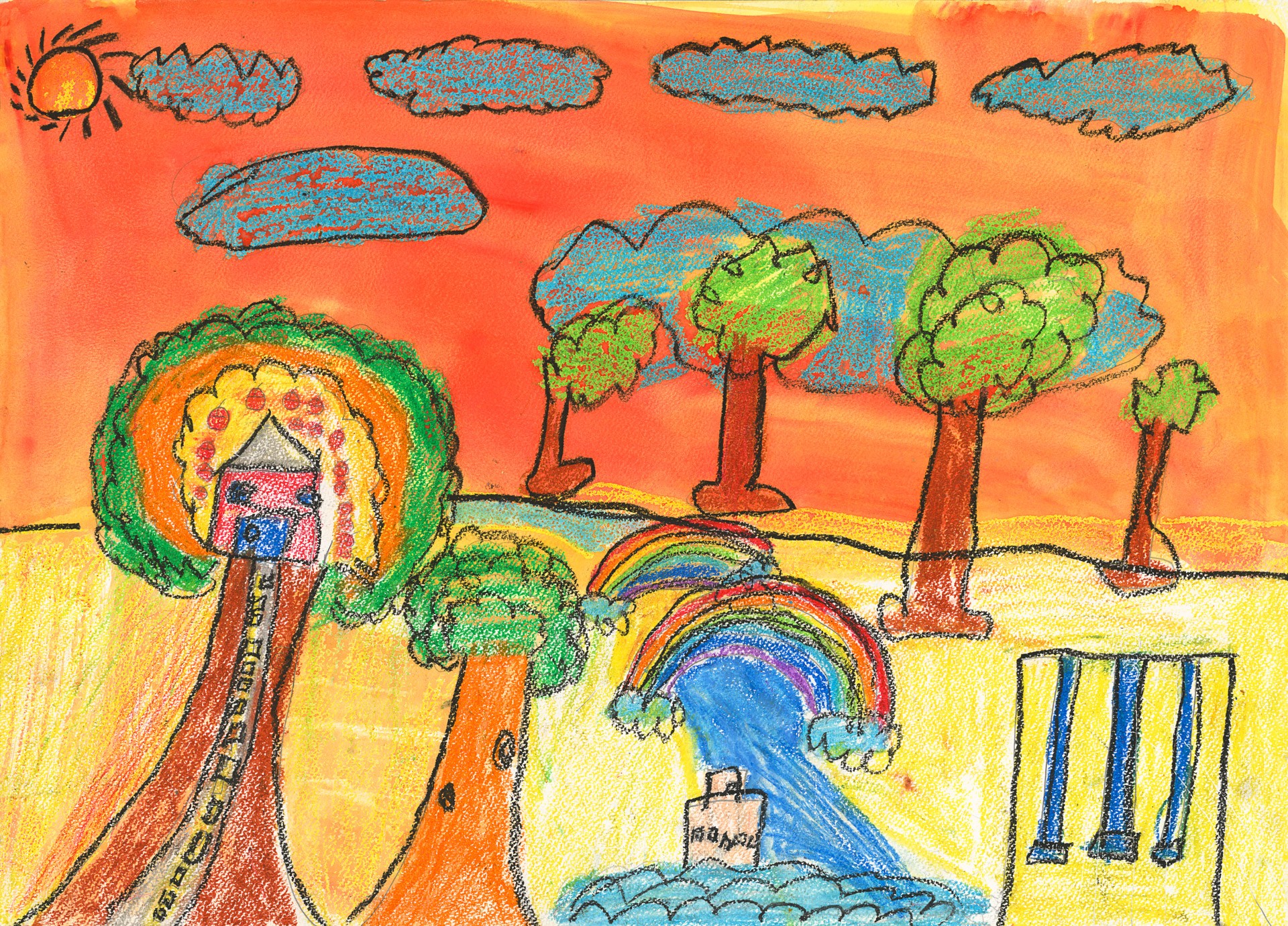 住在樹上,不怕敵人來欺負我,而且還有漂亮的彩虹陪伴我,住在這裡好開心,而且我不會害怕擔心。