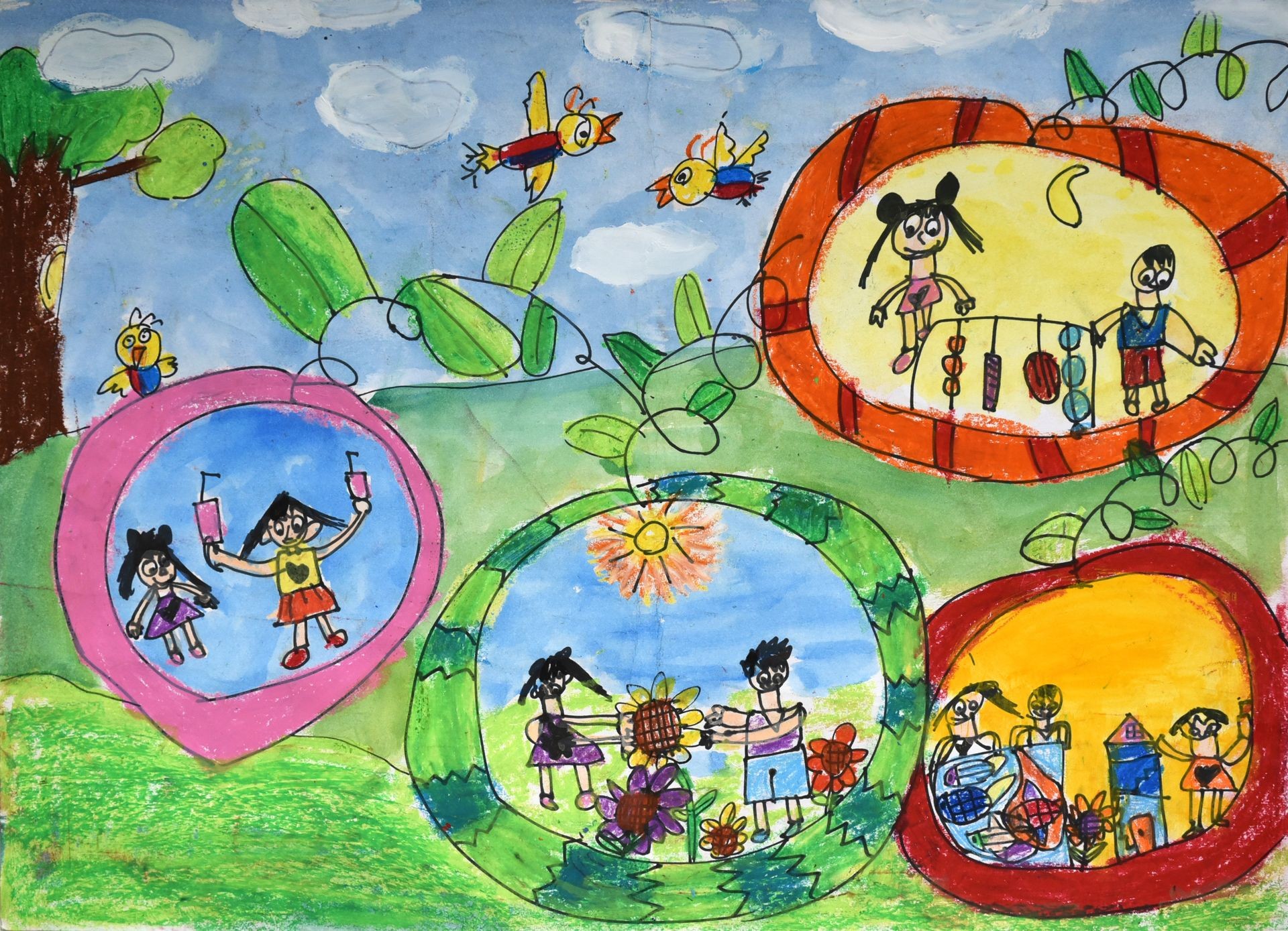 水果之家:有南瓜家放假可以烤肉,蘋果家有池塘可撈魚,西瓜家有美麗的花可賞花,水蜜桃家有果汁可喝,這是我夢想的家。