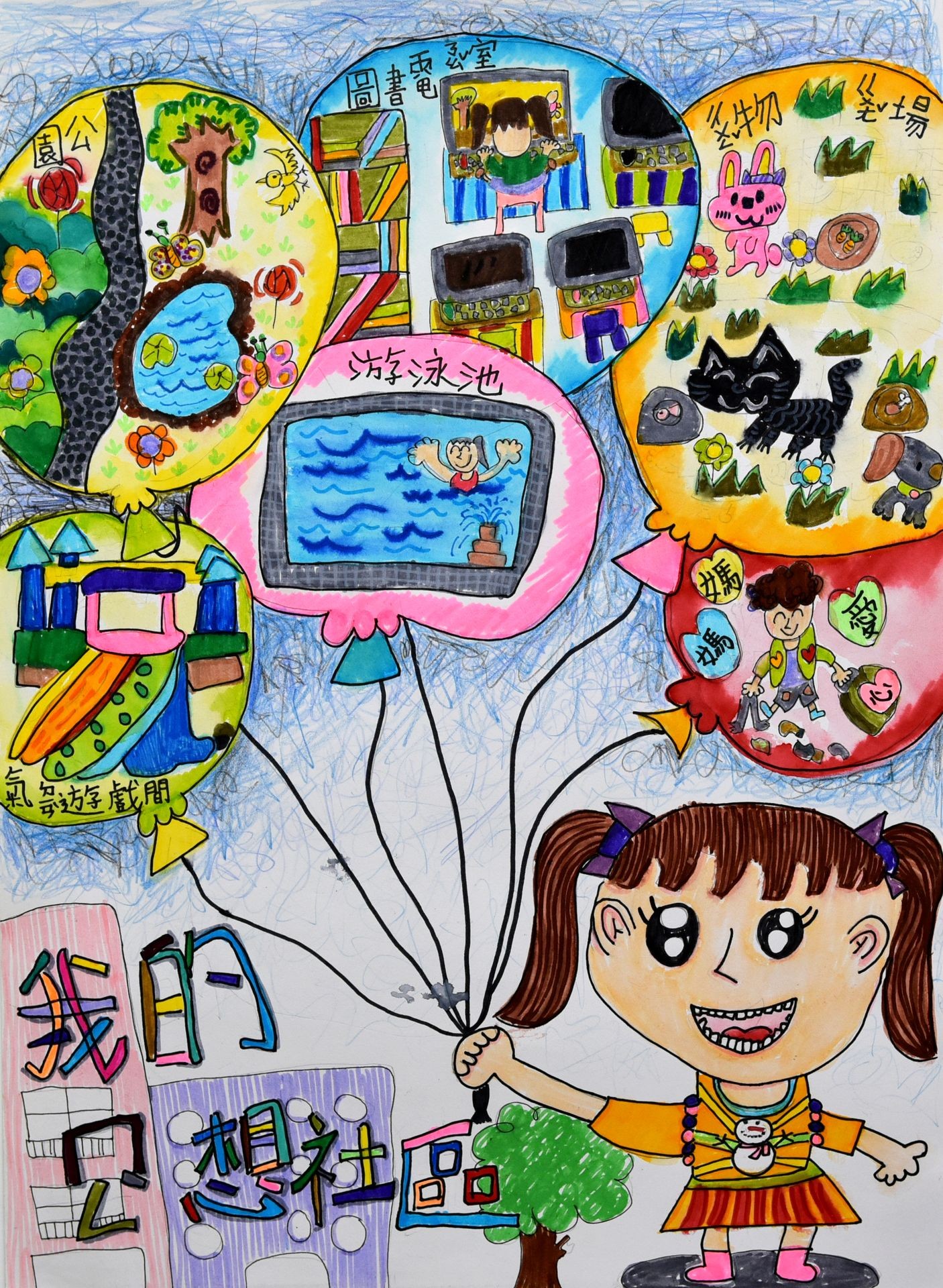 周O羽小朋友: 我夢想中的社區有游泳池,能夠讓我每天玩水。有氣墊遊戲間,讓我無時無刻去溜滑梯。有圖書電腦室,讓我功課可以查資料。有寵物廣場,這樣我就可以養一群動物。有愛心媽媽和我一起照顧這個夢想社區。
