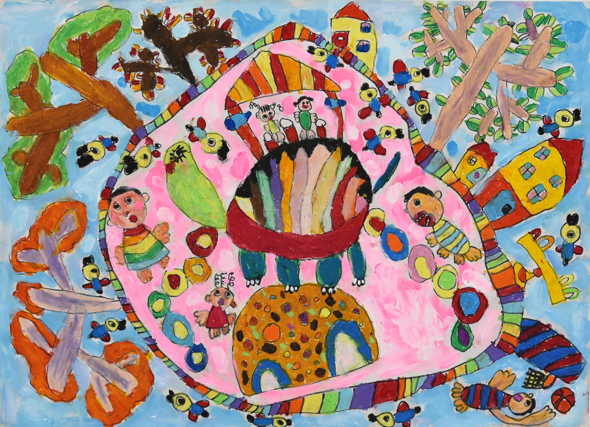 沈O虹小朋友(吳有登老師指導): 我夢想的家社區裡有種很多棵茂密的樹,中間有座遊樂設施,傍晚放學的時候會有很多小朋友和我玩捉迷藏。天空中也有很多小鳥在樹枝間穿梭玩捉迷藏。