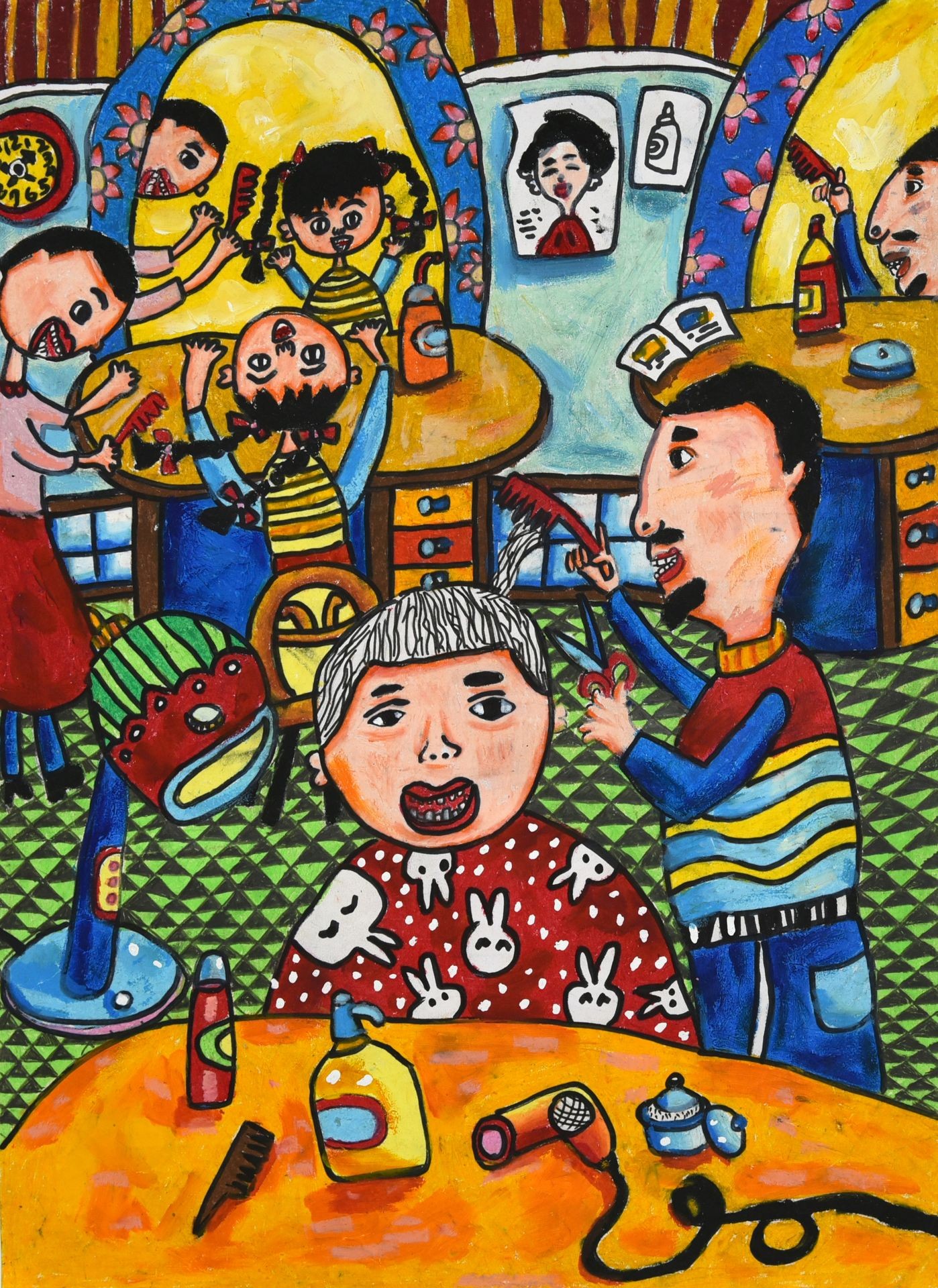 呂O永小朋友(吳有登老師指導): 我們家一樓有一間理髮廳,老闆為人親切就像我們的家人,我頭髮長了就會找老闆理髮。