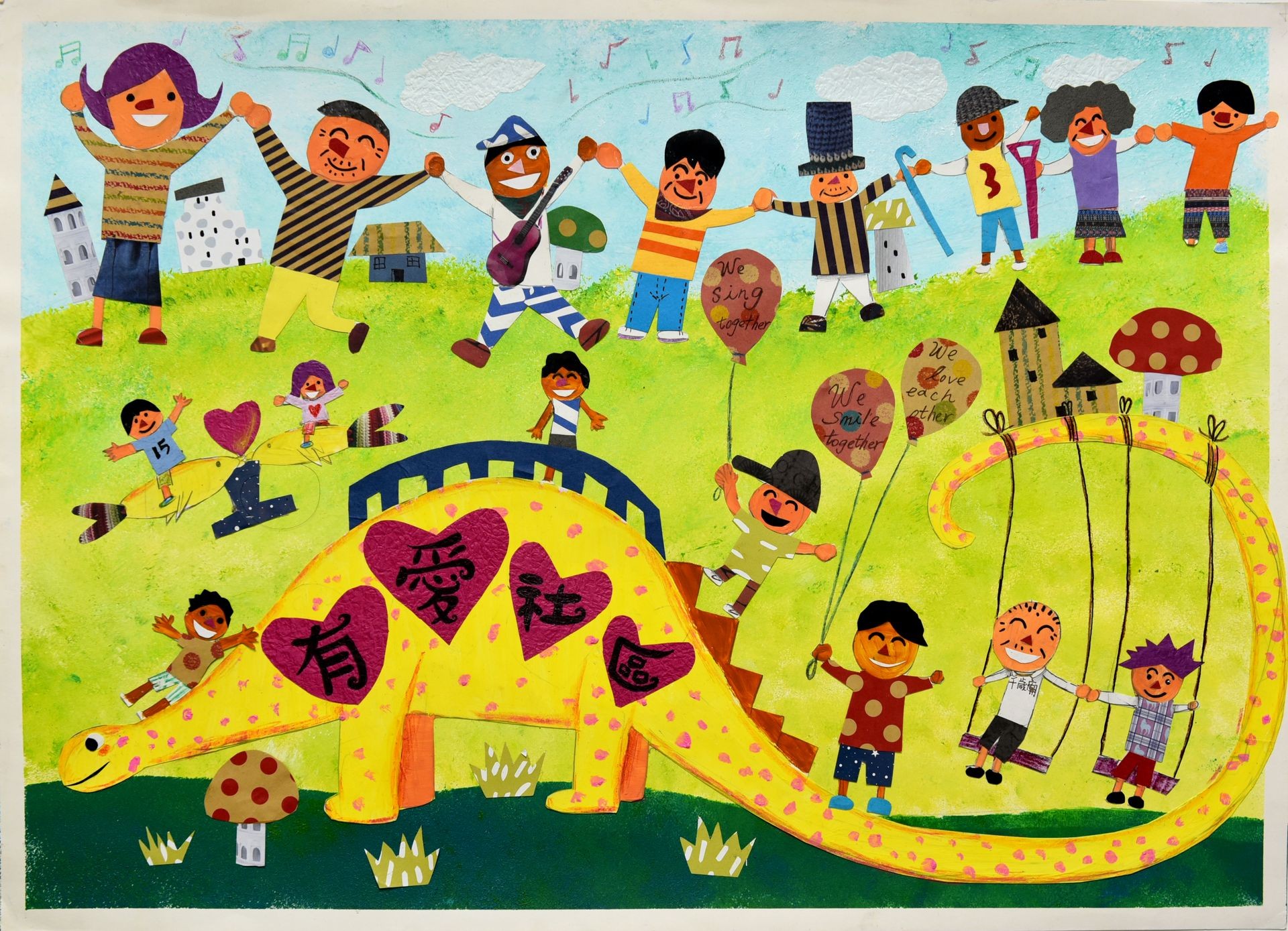 吳O昕小朋友: 有愛社區~不分男女老幼共同生活在一個充滿愛的社區,孩子在大人愛的關懷下成長茁壯,而大人老人在孩童充滿愛的笑聲羽言語中開心生活著。愛就像歡樂音符在社區流動著,大家手牽手用愛創造一個有愛社區園地。