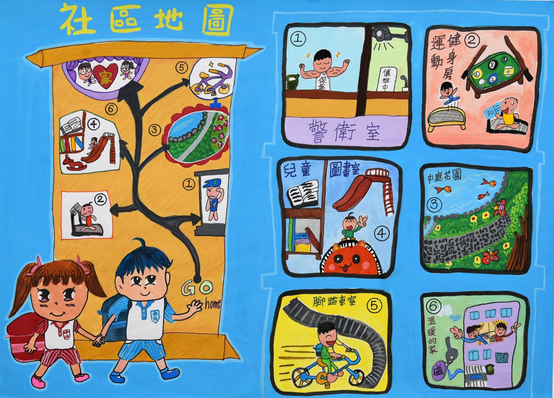 周O喆小朋友: 我想介紹我的社區,用地圖來介紹比較詳細,我跟妹妹放學回家到社區,會先經過保全的警衛室,再來會經過健身房,接著穿過花園中庭,旁邊有一間兒童圖書室,對面是腳踏車停放室(是我現在最喜歡騎車載中庭花園穿梭)最後一間就是我溫暖的家。